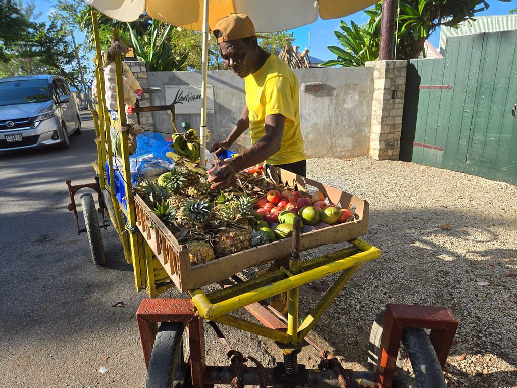 If anything can define the Jamaican experience, it is resiliency – “Dust yourself off, pick yourself up, and start all over again” is the refrain that plays over and over in the lives of every Jamaican. It is also inventiveness with scant resources. The pushcart has been at the heart of daily commerce with its constant demands on strength and perseverance. Rather than grinding it out on a design handed down over generations, this vendor found that motorcycle wheels on stronger axles and a welded frame reduced the effort to one finger, bringing trays of fresh fruit and vegetables to the front gate.